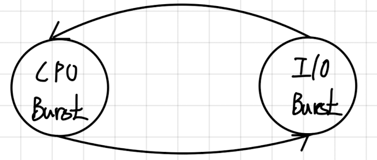 CPU Burst는 CPU 자원을 집중적으로 활용하는 구간을 말한다. 반면, I/O Burst는 I/O operation이 집중하는데 걸리는 시간을 말한다. 예를 들면, load store, add store, read from file 등의 명령어 수행은 CPU Burst이고 wait for I/O는 I/O Burst라 볼 수 있다. 이렇듯 computer program의 특징으로 인하여 CPU Burst와 I/O Burst는 서로 번갈아가며 나올 수 밖에 없고 이러한 cycle을 CPU-I/O Burst Cycle라 한다.